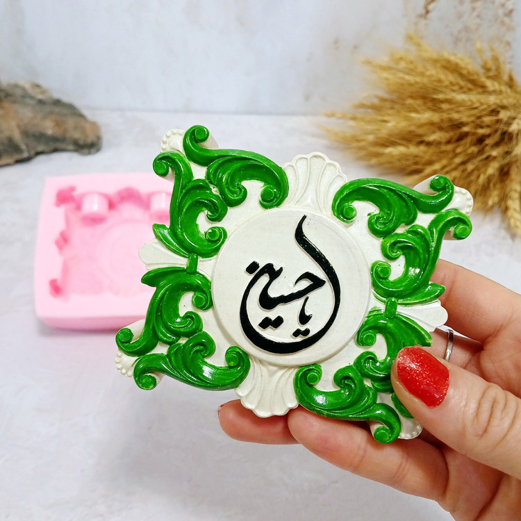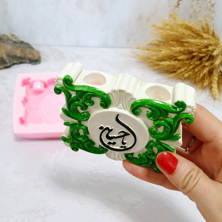 قالب شمع سیلیکونی مدل کتیبه یا جاشمعی یا حسین با برند کوشا اکسسوری کار استثنایی و مناسبتی و مذهبی میباشد این قالب مناسب شمع سازی ، اکسسوری سنگ مصنوعی ، مجسمه سازی و رزین میباشد که با بالاترین کیفیت و بهترین نوع سیلیکون تولید شده است قالب با تضمین بدون حباب ، نرم و قابل انعطاف میباشد ابعاد حدودی خروجی کتیبه و جاشمعی یا حسین از قالب با پهنای 2 سانت و طول و عرض 8 * 9 سانت و قطر جاشمعی 1/5 سانت برای شمع های قلمی میباشد.