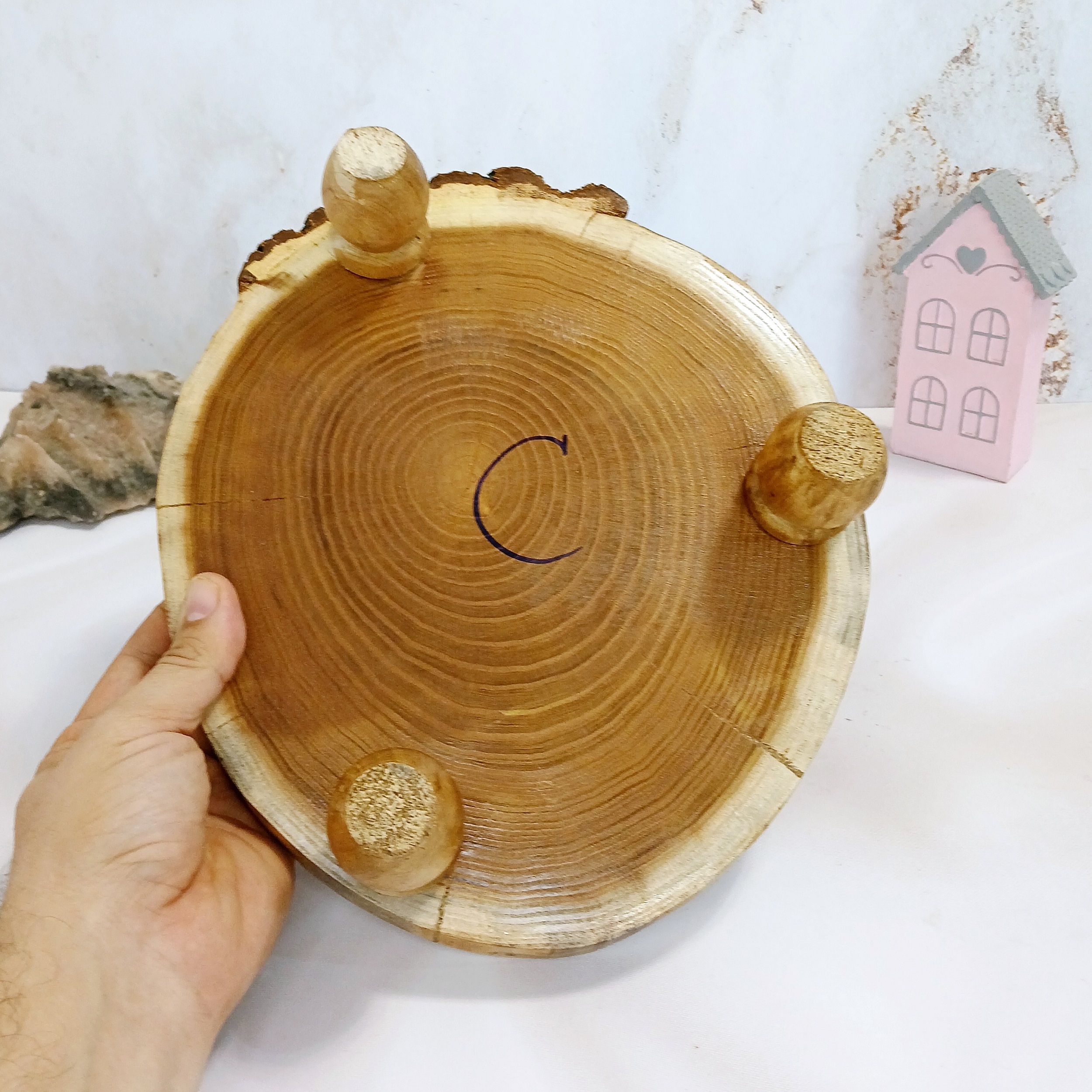 ابعاد تخته سرو پایه دار طرح خورشید کد C101 با اندازه 29* 25 سانت با ارتفاع ۸ سانت میباشد تخته روستیک از چوب درخت توت درست شده و پایه ها از چوب گردو میباشد دارای 3 تا پای هستش و شکل روی تخته گرد دفرمه میباشد