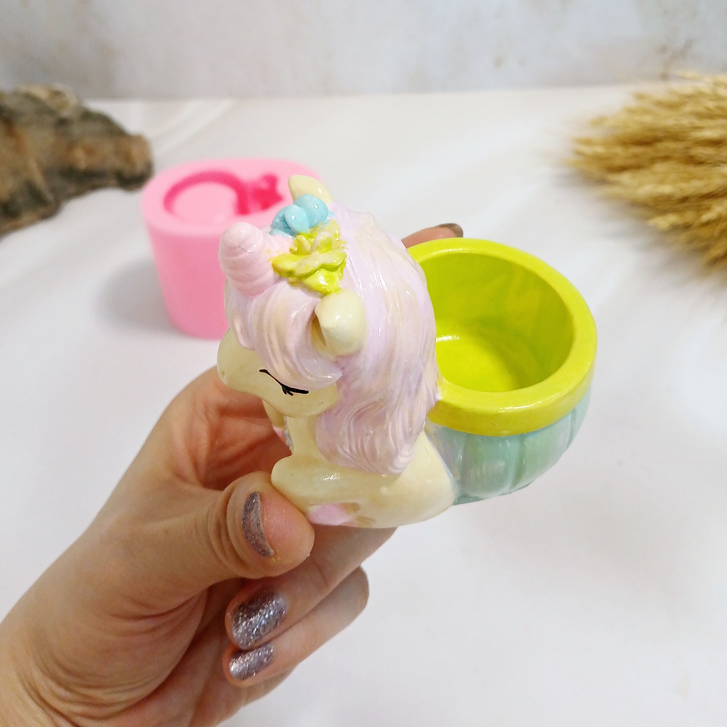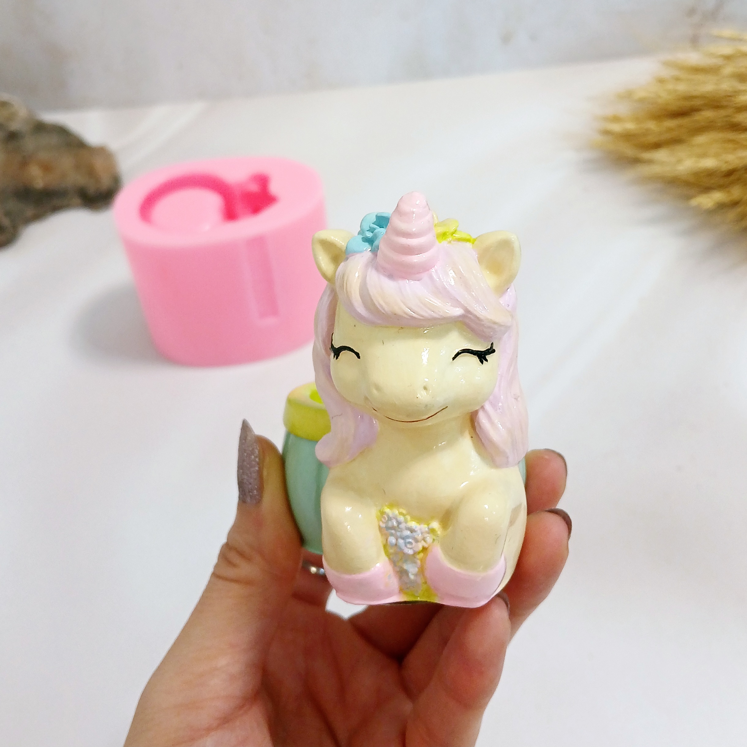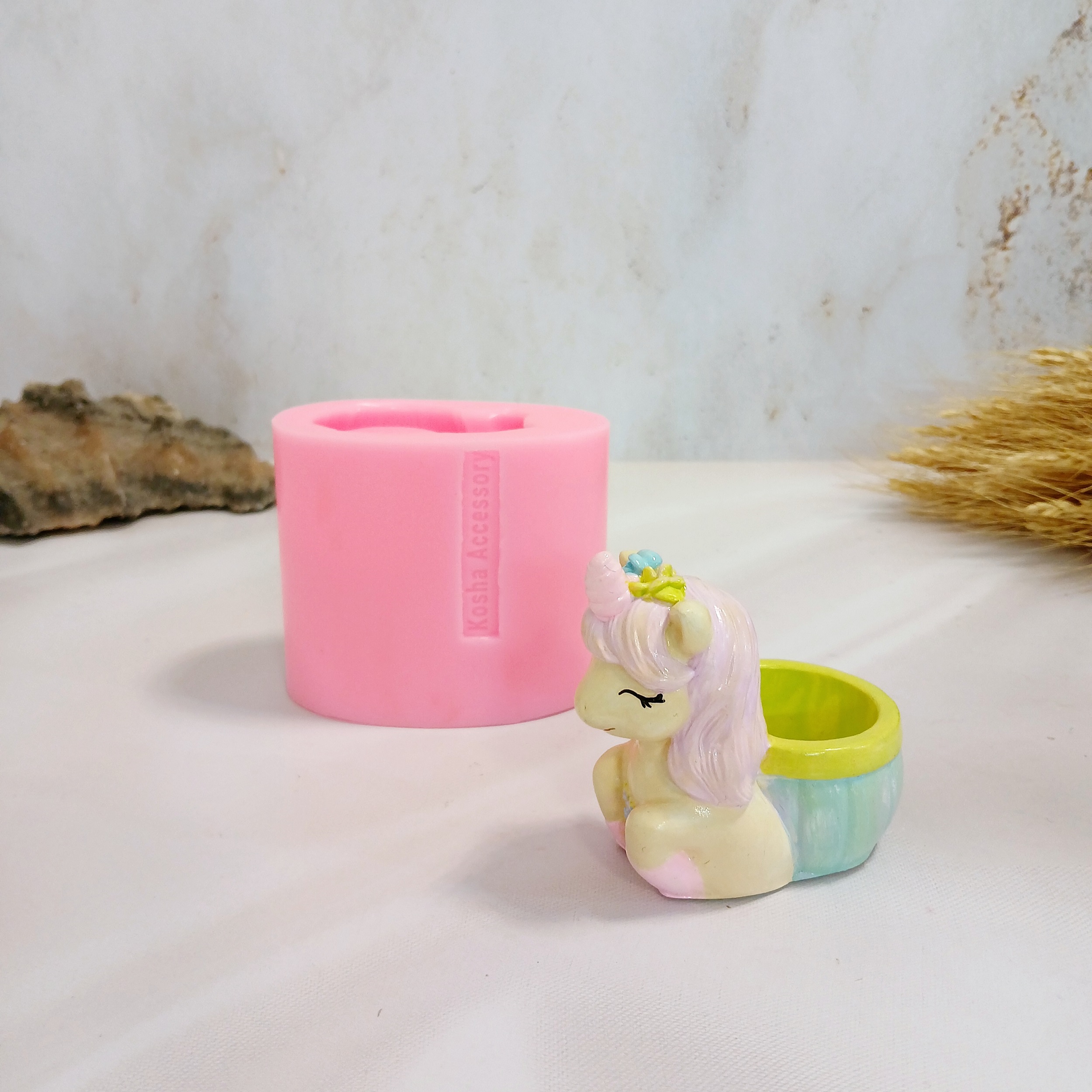 ابعاد حدودی خروجی کار: با اندازه 8 * 5/5 سانت و ارتفاع 8 سانت میباشد .قطر داخلی جاشمعی اسب یونیکورن حدود 4 سانت میباشد