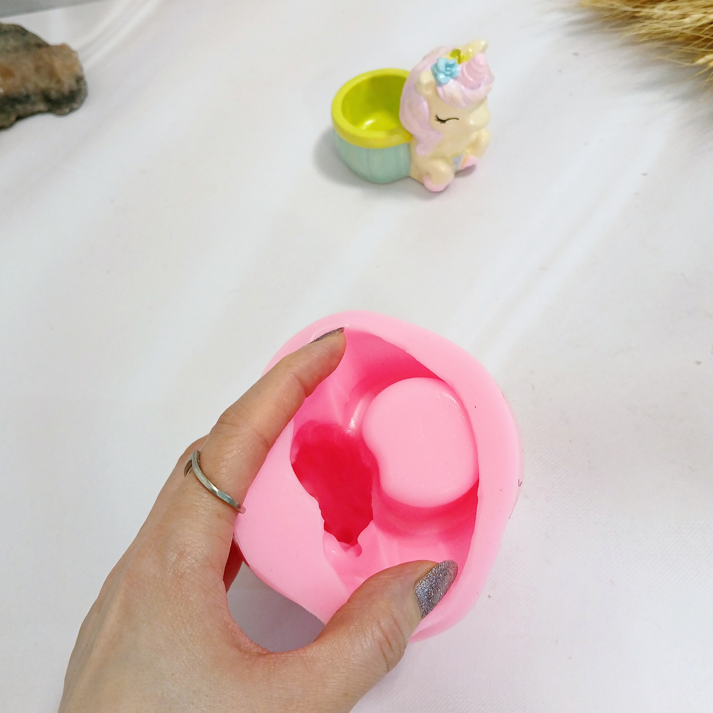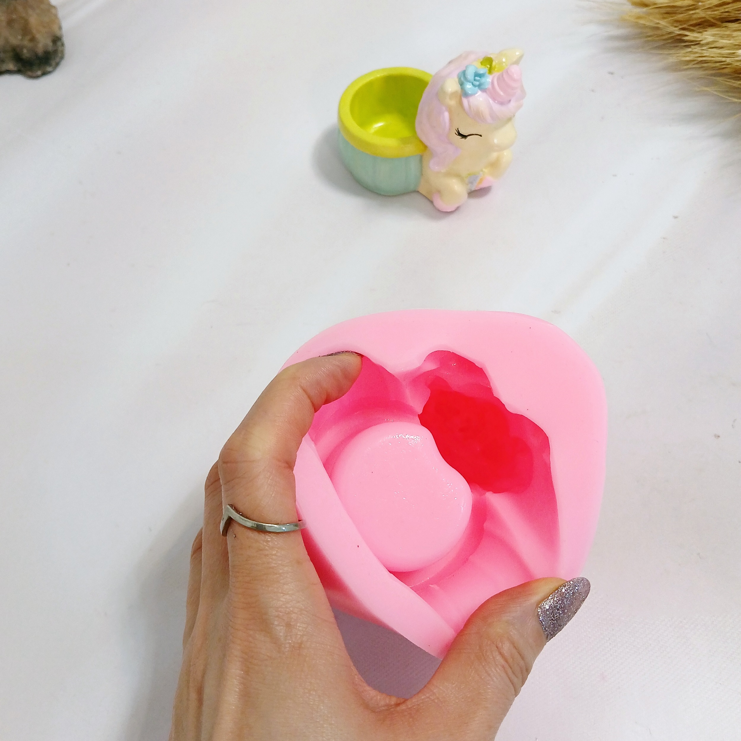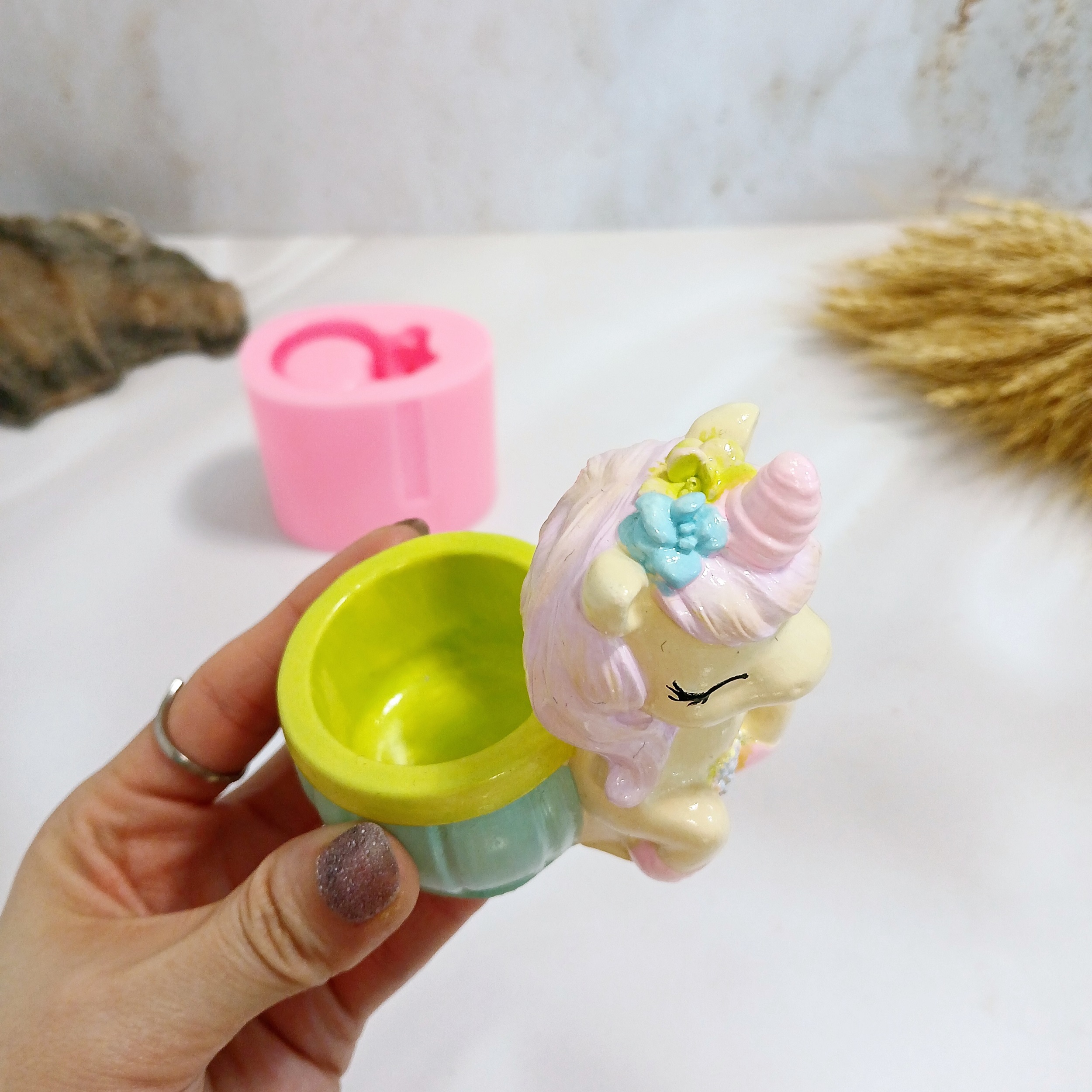 ابعاد حدودی خروجی کار: با اندازه 8 * 5/5 سانت و ارتفاع 8 سانت میباشد .قطر داخلی جاشمعی اسب یونیکورن حدود 4 سانت میباشد